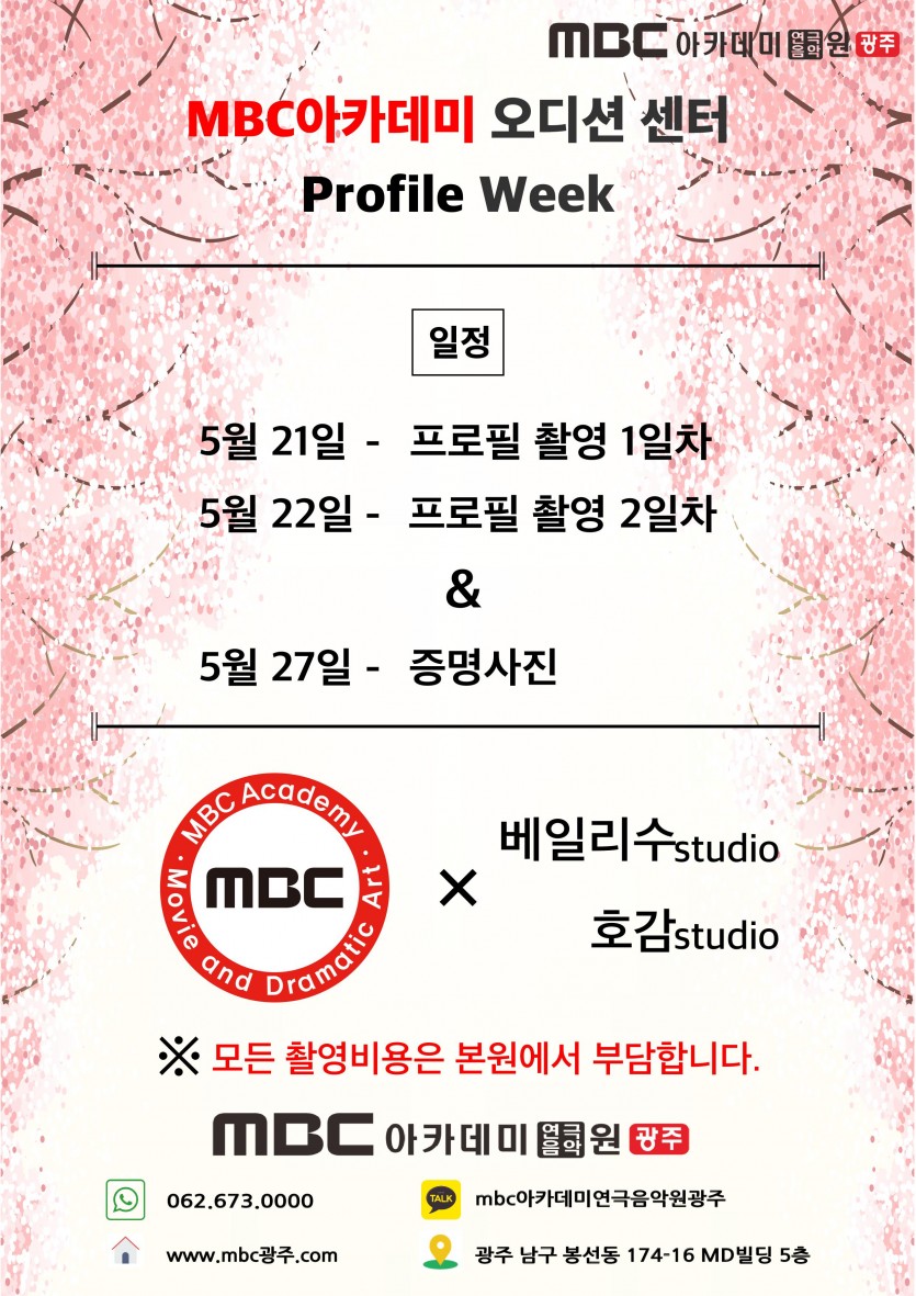 < 프로필 위크 > - 수강생 전원 프로필 촬영 페이지 정보 작성자 관리자 댓글 0건 조회 32,518회 작성일 19-04-15 21:25 본문 < 프로필 위크 > - 수강생 전원 프로필 촬영 목록 이전글 [연기센터] 모델연기반 개강 19.05.21 다음글 2020학년도 예고입시반 모집 19.04.12