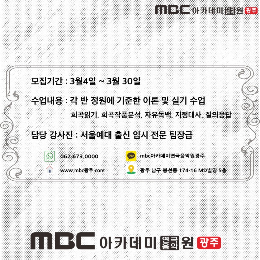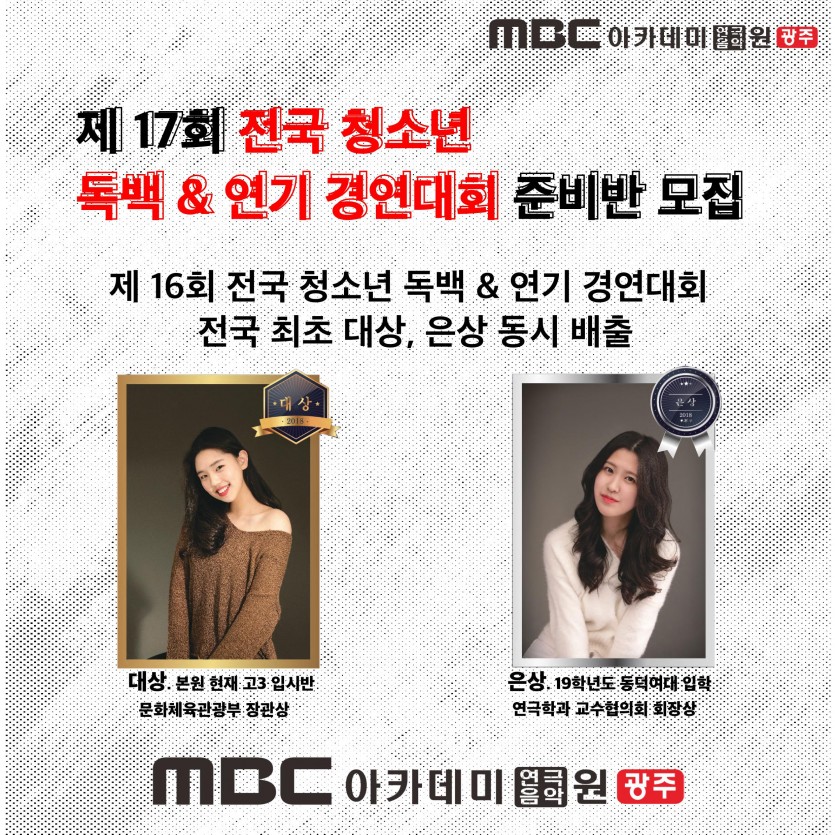 2019년 전국 청소년 독백&연기 경연대회 준비반 모집 페이지 정보 작성자 관리자 댓글 0건 조회 33,202회 작성일 19-03-08 17:28 본문 2019년 전국 청소년 독백&연기 경연대회 준비반 모집 목록 이전글 [연기센터-모델연기전공] 이석빈 학생 한림예고 편입학 합격 19.04.05 다음글 2020학년도 입시반 모집 19.03.03