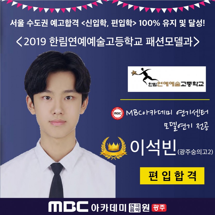 [연기센터-모델연기전공] 이석빈 학생 한림예고 편입학 합격 페이지 정보 작성자 관리자 댓글 0건 조회 33,246회 작성일 19-04-05 17:40 본문 [연기센터-모델연기전공] 이석빈 학생(숭의고 2) 한림예고 편입학 합격 목록 이전글 한예종 연극원 연기과 2020학년도 모집요강 19.04.05 다음글 2019년 전국 청소년 독백&연기 경연대회 준비반 모집 19.03.08