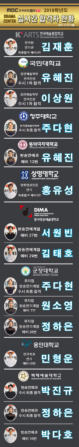 [드라마센터] 2018학년도 수시합격자 현황 페이지 정보 작성자 관리자 댓글 0건 조회 32,206회 작성일 17-11-29 20:03 본문 2018학년도 수시합격자 현황 목록 이전글 [뮤직센터] 2018학년도 수시합격자 현황 17.11.29 다음글 [모델센터] 프로젝트 런웨이 8기 모델캠프 17.11.27