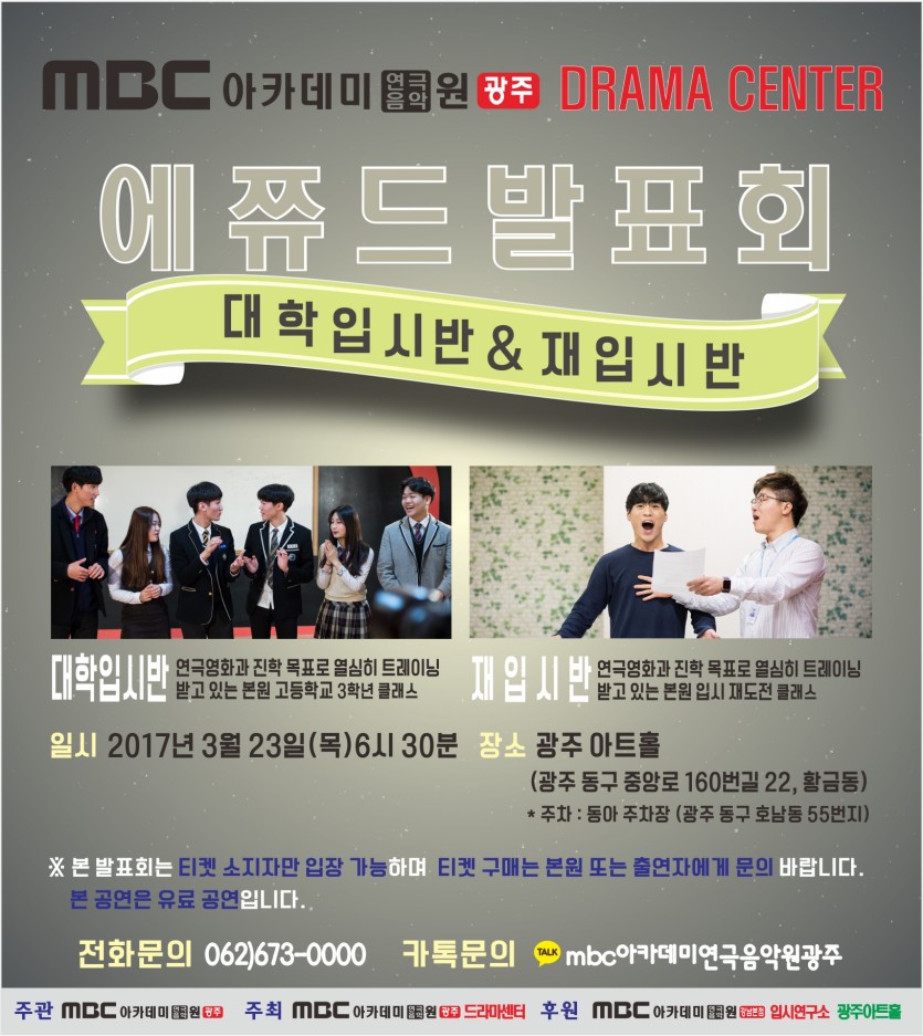대학입시반&재입시반 에쮸드 발표회 페이지 정보 작성자 관리자 댓글 0건 조회 29,596회 작성일 17-02-28 22:49 본문 에쮸드발표회 - 대학입시반&재입시반 목록 이전글 [드라마센터]벚꽃이벤트-친구야!우리 꽃길만 걷자 17.03.03 다음글 입시대비반&틴스타반 에쮸드 발표회 17.02.27