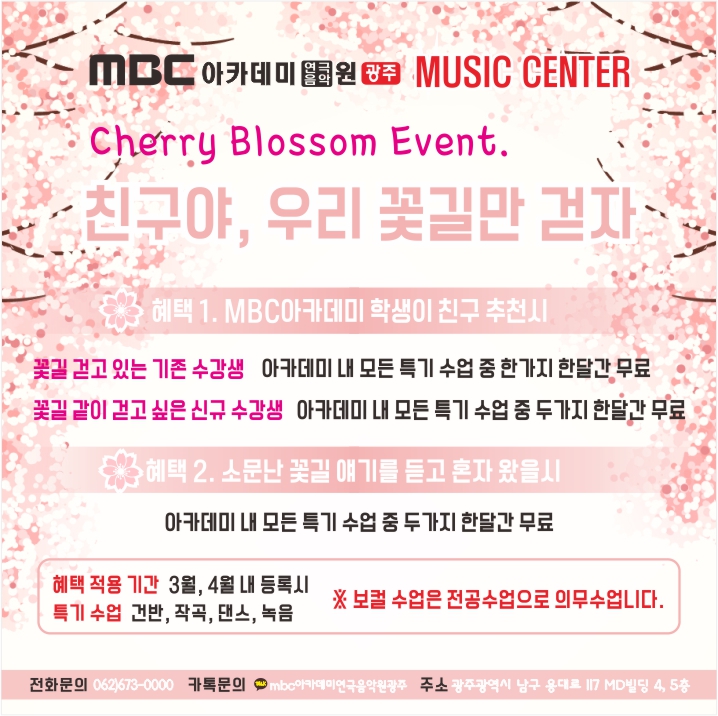 [뮤직센터]벚꽃이벤트-친구야! 우리 꽃길만 걷자 페이지 정보 작성자 관리자 댓글 0건 조회 29,895회 작성일 17-03-03 22:31 본문 새학기 이벤트 벚꽃이벤트-친구야! 우리 꽃길만 걷자 목록 이전글 3월,4월 추천도서 " 벚꽃동산 " 17.03.08 다음글 [드라마센터]벚꽃이벤트-친구야!우리 꽃길만 걷자 17.03.03