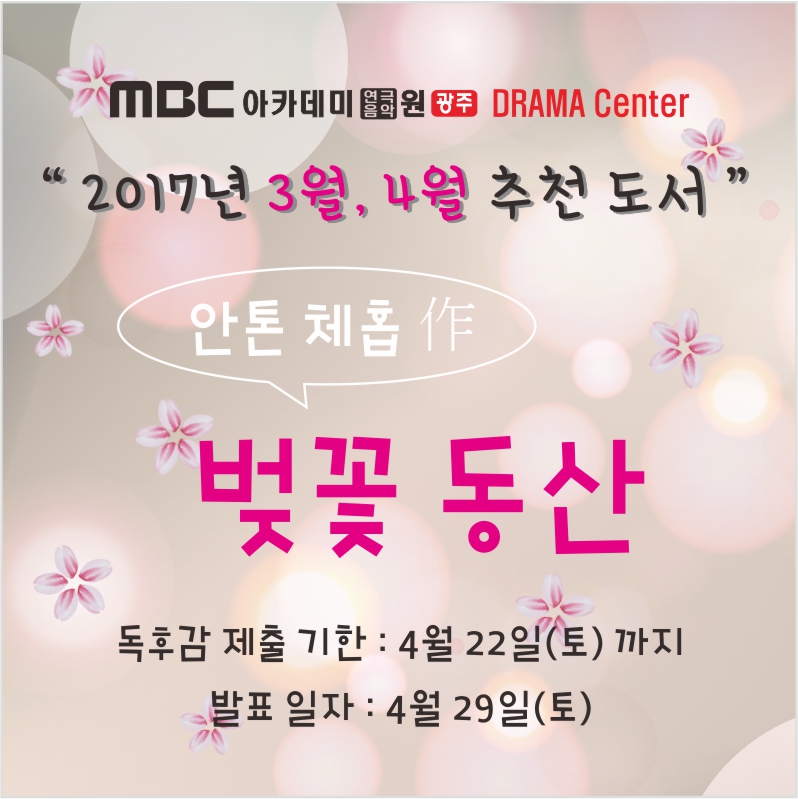 3월,4월 추천도서 " 벚꽃동산 " 페이지 정보 작성자 관리자 댓글 0건 조회 29,763회 작성일 17-03-08 19:17 본문 안톤체홉 "벚꽃동산" 목록 이전글 [드라마센터]성인데뷔반 모집! 17.03.10 다음글 [뮤직센터]벚꽃이벤트-친구야! 우리 꽃길만 걷자 17.03.03