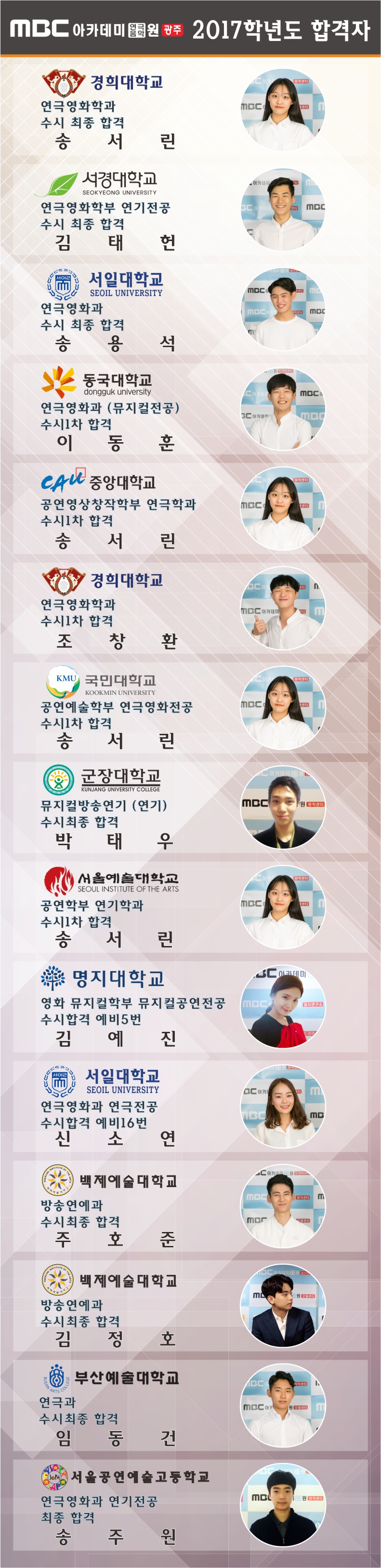 2017학년도 합격자 페이지 정보 작성자 관리자 댓글 0건 조회 29,346회 작성일 16-10-17 18:12 본문 2017학년도 합격자 목록 이전글 [드라마센터] 제4회정기공연 "안네의일기" 광주문화관광책자 "문화마실"에 실리다. 16.10.26 다음글 [뮤직센터] 2016년 10월 무료체험캠프 16.10.06
