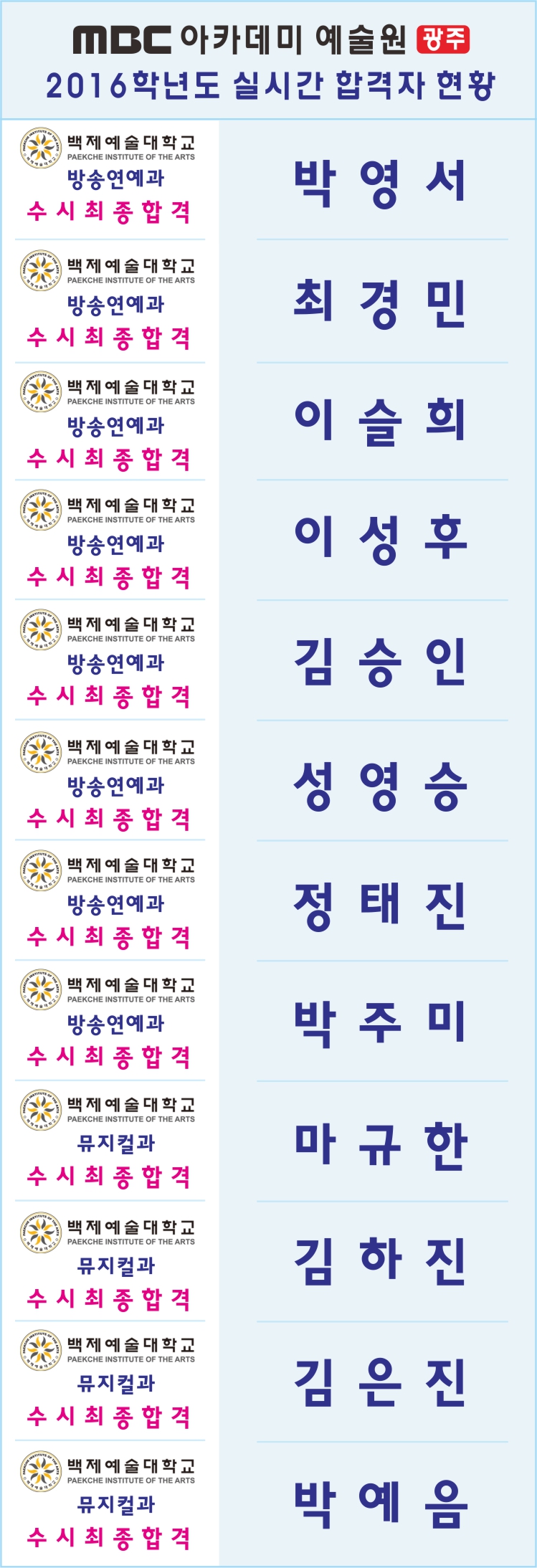 2016학년도 실시간 합격자 현황 [백제예대] 페이지 정보 작성자 관리자 댓글 0건 조회 27,688회 작성일 15-10-21 21:07 본문 2016학년도 실시간 합격자 현황 목록 이전글 2016학년도 실시간 합격자 현황 [호원대] 15.10.22 다음글 2016학년도 실시간 합격자 현황 [서울예대] 15.10.20