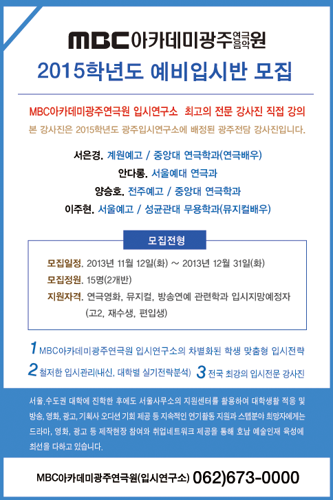 2015학년도 대학 예비입시반 모집 페이지 정보 작성자 관리자 댓글 0건 조회 27,503회 작성일 14-11-12 20:49 본문 MBC아카데미광주연극음악원 2015학년도 대학입시반 모집 - 연극영화과/뮤지컬/방송연예 목록 이전글 (합격자 발표)방송.엔터테인먼트 멘토링캠프 참가자를 모집합니다. 14.11.12 다음글 MBC아카데미광주연극음악원 정기공연#.1 뮤지컬갈라쇼 14.11.12