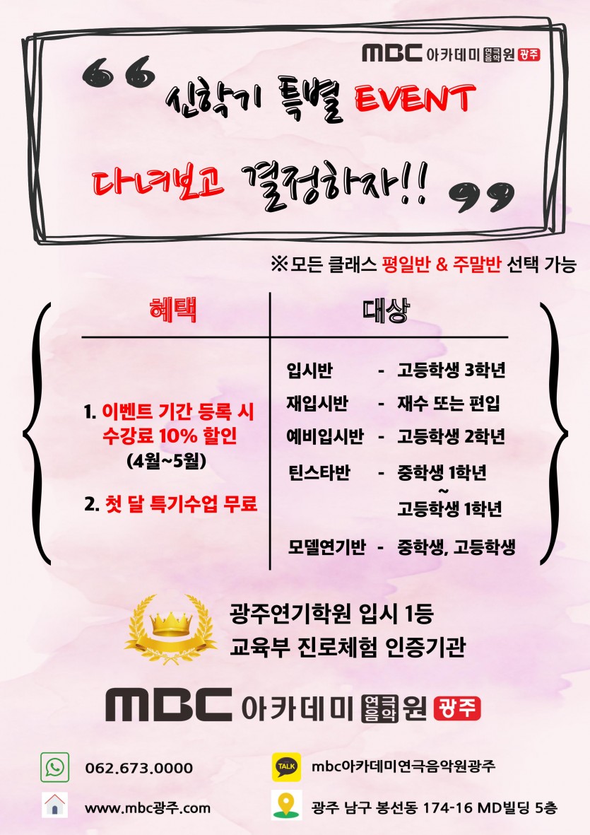 신학기 특별 EVENT - 다녀보고 결정하자 페이지 정보 작성자 관리자 댓글 0건 조회 26,274회 작성일 19-04-02 22:34 본문 신학기 특별 EVENT - 다녀보고 결정하자 목록 이전글 모델연기 입시체험캠프 1기 19.04.06 다음글 <배우특강> 진선규 배우 19.02.08