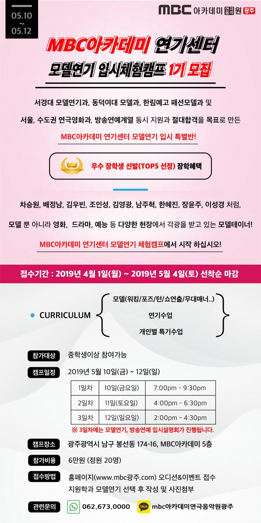 모델연기 입시체험캠프 1기 페이지 정보 작성자 관리자 댓글 0건 조회 26,118회 작성일 19-04-06 18:32 본문 오디션&이벤트 접수에서 지원학과 모델연기를 선택 후 작성 및 사진첨부 해주시면 됩니다! 목록 이전글 예비입시반 입시체험 수업 19.04.23 다음글 신학기 특별 EVENT - 다녀보고 결정하자 19.04.02