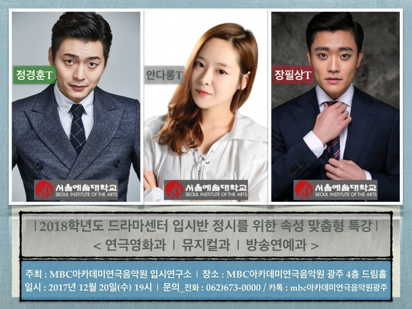 2018학년도 정시를 위한 드라마센터 속성 맞춤형 특강 페이지 정보 작성자 관리자 댓글 0건 조회 24,809회 작성일 17-12-16 19:08 본문 2018학년도 정시를 위한 드라마센터 속성 맞춤형 특강 목록 이전글 [드라마센터] 20주년 기념 장학생 선발 오디션 - 연기 / 뮤지컬 18.01.05 다음글 FNC엔터테인먼트 오디션 17.12.14