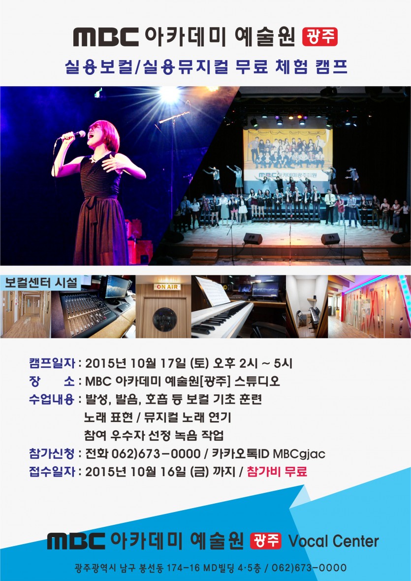 실용보컬/실용뮤지컬 체험캠프 페이지 정보 작성자 관리자 댓글 0건 조회 23,952회 작성일 15-10-02 16:10 본문 실용보컬/실용뮤지컬 체험캠프 목록 이전글 연극영화과 / 뮤지컬과 무료 체험캠프 15.10.29 다음글 울림엔터테인먼트 오디션 15.09.12